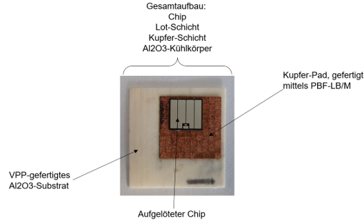 Zur Umsetzung klassischer leistungselektronischer Aufbauten wie Wechselrichter oder High-Power-LED-Module werden die eingesetzten Kühlkörper und Metall-Keramik-Substrate bislang in getrennten, langen Prozessketten gefertigt und anschließend über Fügeprozesse wie Kleben, Löten oder Sintern verbunden. Im Rahmen des Projekts wurde gezeigt, dass additive Fertigungsverfahren diese Prozessketten signifikant verkürzen können, indem das keramische Substrat als Kühlkörper genutzt wird. Die leistungselektronischen Aufbauten wurden dabei erfolgreich durch eine kombinierte additive Fertigungsstrategie realisiert, bei der keramische und metallische Strukturen funktionsgerecht integriert hergestellt wurden.